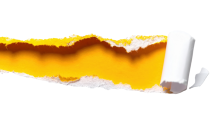 Closeup of a violently torn, jagged hole in thick yellow paper against a clean white backgr