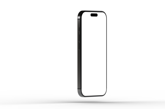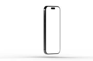 High-quality photo of a black smartphone mockup with a blank screen, perfect for app presentations or website designs. Isolated on white backgr