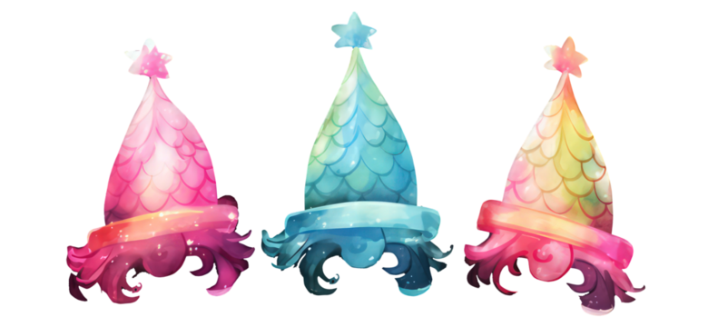 Watercolor party hats three different types on white backhround, Mermaid Watercolor, Sealife, Oceanlife, decoration, Under the Sea Clipart, decorative elements, kids story book, fairy tail, greeting
