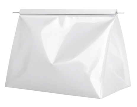 A sleek, crumpled white bag with a top seal, designed for storage or packaging.