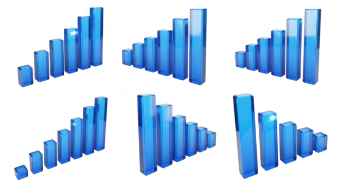 3D glass bar graphs rise and fall showcasing statistical data on white background useful for business presentations