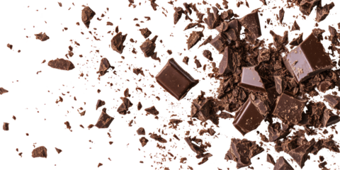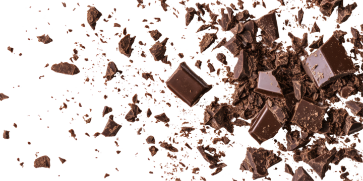 Vivid representation of chocolate bar crumbs isolated against a clean white backdrop, capturing detailed textures.