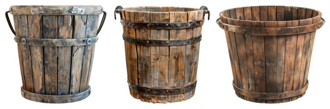 Rustic wooden bucket with metal handle, vintage style on transparent background