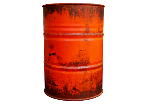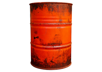 Old rusted Orange steel oil barrel isolated on transparent or white background