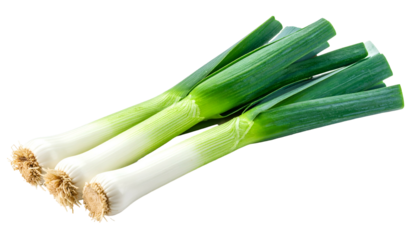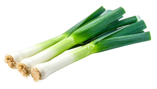 Three fresh leeks, white base fading to vibrant green leaves, isolated on a black background