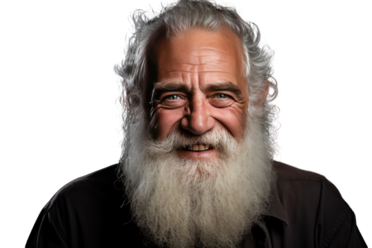 An elderly man with a white beard and a warm smile represents wisdom and experience. Isolated on a transparent background.