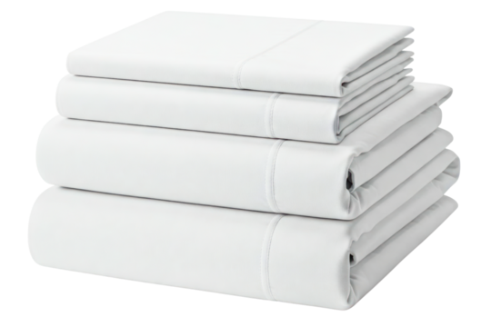Stack of neatly folded white bed sheets including pillowcases isolated on a transparent background