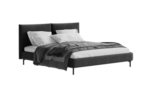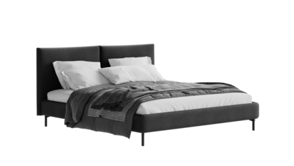 Modern black bed with bedding on an isolated background. Furniture for colleges, marketing, and presentations.