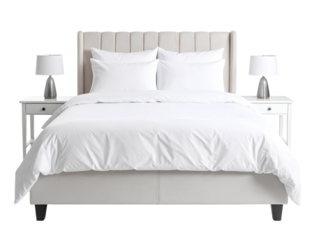 Luxurious king-size bed with fresh white sheets isolated on transparent background.
