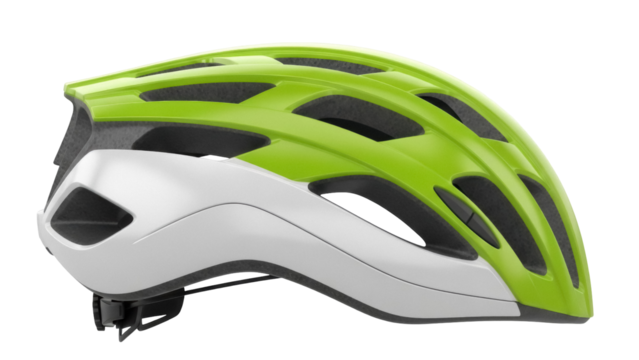 Green and white bicycle helmet isolated PNG on transparent background, safety gear for cycling and outdoor sports