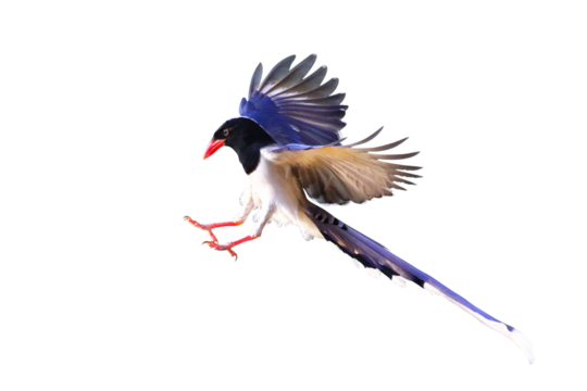 Beautiful flying Red-billed Blue Magpie isolated on transparent background png file