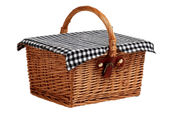 Square wicker picnic basket with black and white checkered cloth cover.  Brown wicker, wooden handles, and leather strap closure