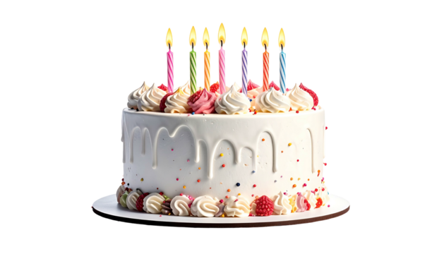 Vibrant tiered birthday cake with glowing candles on transparent background