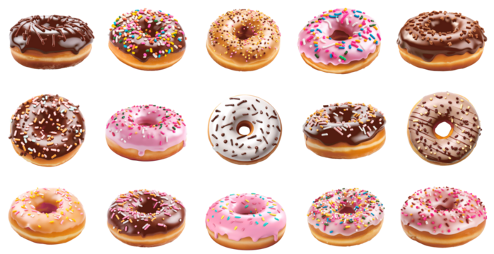 A row of donuts with different toppings, including chocolate and sprinkles Set of png elements.