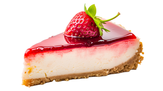A slice of cheesecake with a strawberry on top isolated on a white background