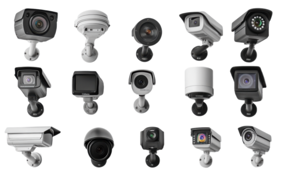 A close up of two white security cameras mounted on a pole against a black background outdoors