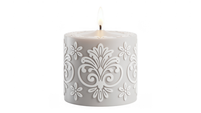 White candle with floral and flame floral burning candle isolated on a transparent background