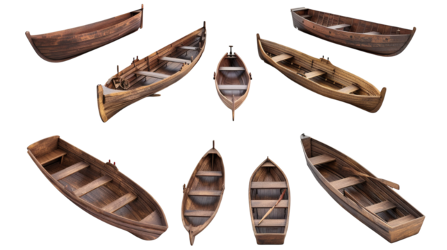 A beautifully crafted traditional wooden canoe with intricate carvings and a weathered appearance, transparent background, png, isolated on white background