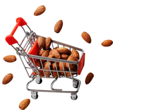 A small shopping cart filled with almonds scattered on a clean white surface, showcasing a playful food shopping moment isolated on transparent background