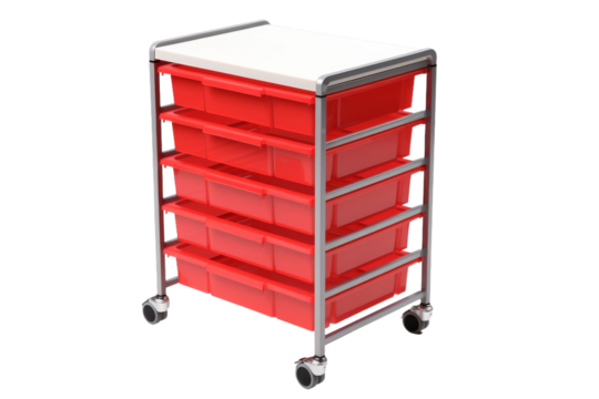 Red and White Cart With Six Plastic Bins. On a White or Clear Surface PNG Transparent Background.