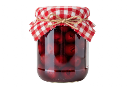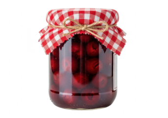 A glass jar filled with delicious red cherries, preserved and ready to be enjoyed, isolated on transparent background the jar is sealed with a charming red and white checkered cloth
