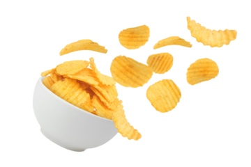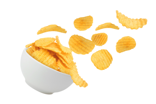 potato chips falling isolated on white background cutout and isolated on transparent background