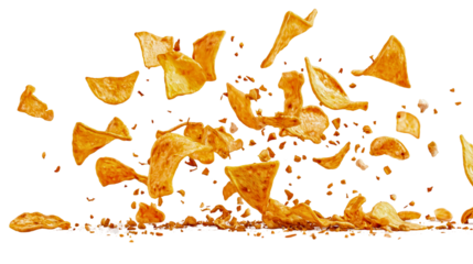 Crispy tortilla chips falling on a white background, spicy Mexican snack with chili and cheese, traditional fried nachos as a tasty appetizer or fast food option