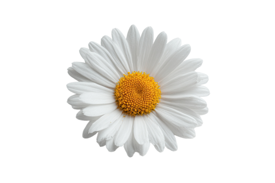 A perfectly centered, close-up of a daisy with white petals and a bright yellow center, isolated