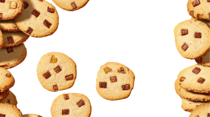 A scattered arrangement of delicious chocolate chip cookies on a white background, creating an appetizing visual appeal. transparent background