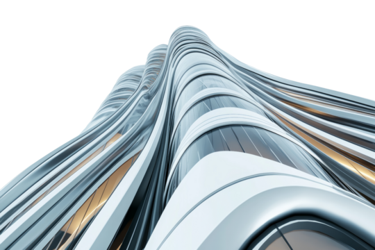 Detailed 3D rendering of a futuristic skyscraper, showcasing sleek design elements, isolated on white background