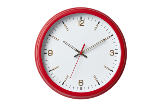 A red alarm clock with white face and black numbers on a black background showing the time is ten past twoisolated on transparent background
