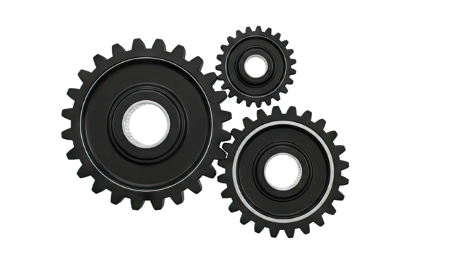 Three interlocking grey cogs on transparent background