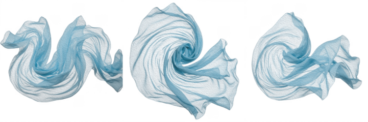 Set of abstract blue flowing fabric isolated on white background, ethereal wavy chiffon silk cloth shapes for design elements.