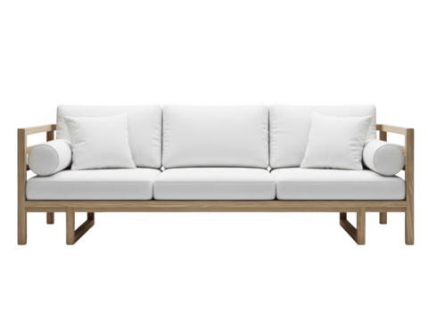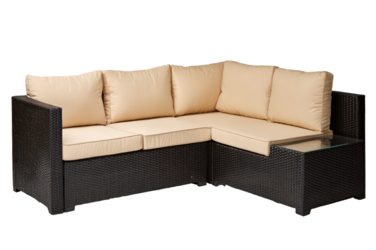 Modern outdoor sofa with white cushions isolated on transparent background
