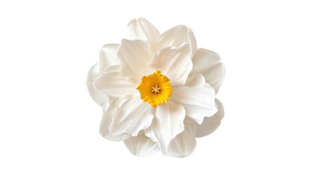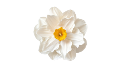 A closeup studio shot of a cluster of white daffodils with bright yellow centers, isolated on a transparent background
