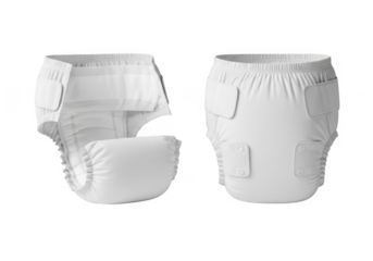 Two white adult diapers shown from front and side views isolated on transparent background