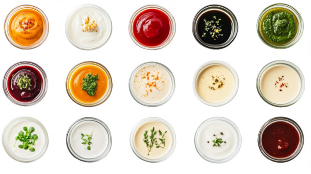 A row of white bowls with different colored sauces