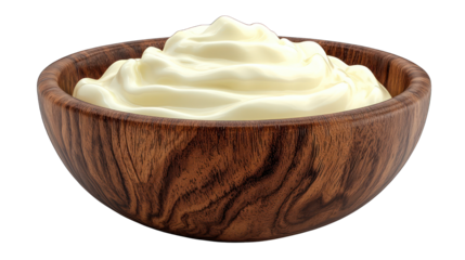 A white background is focused on sour cream, mayonnaise, yogurt and mayonnaise with a wooden spoon in the foreground, and the background is white.