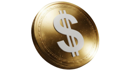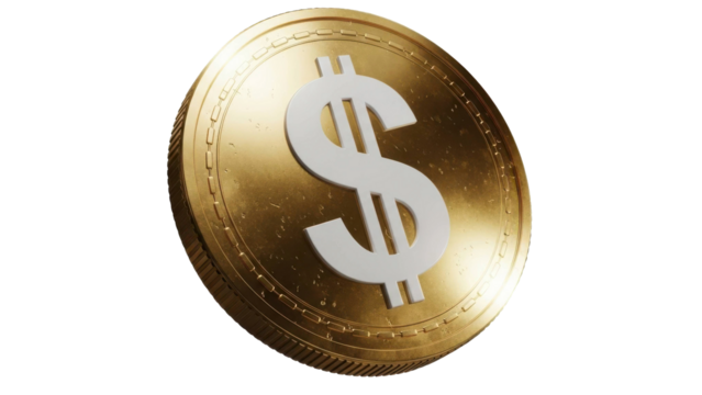 Photo of a single gold coin with a prominent dollar sign is isolated on a clean transparent background