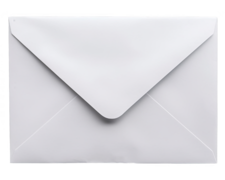 A blank white envelope isolated on a white background, transparent background. The envelope is closed and ready for mailing.