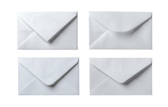 Four blank white envelopes arranged in a grid.  Each envelope shows the folded flap,  a rectangular shape, and subtle texture