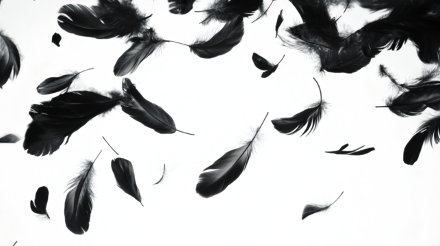 Abstract flying goose black feathers floating on white background.