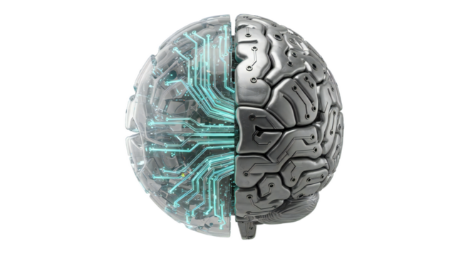 Ultra-realistic robotic brain—transparent polymer microchip left and chrome-circuit right hemisphere, glowing fibers for AI innovation. Isolated on transparent background, png.