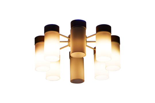 Black decorative lamp hanging from ceiling modern lamp with golden yellow light isolated on cut out PNG or transparent background. Decoration equipment for home. Modern interior accessories.