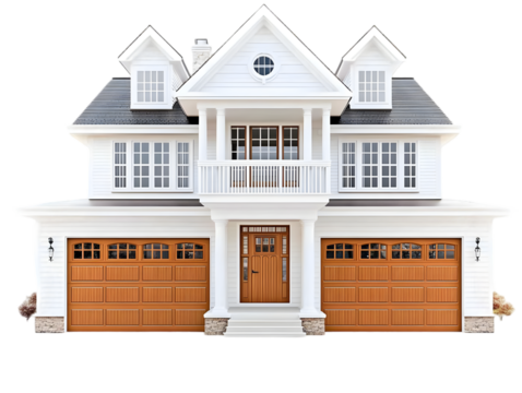 Architectural Illustration of a Two Story White House with Brown Wooden Doors and Garage