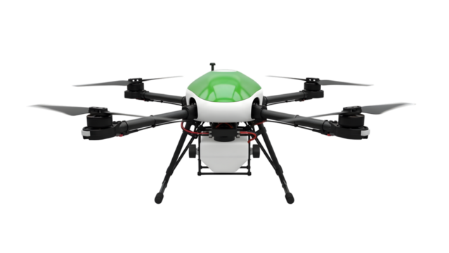 White and green drone with black propellers and landing gear isolated on a transparent background quadcopter