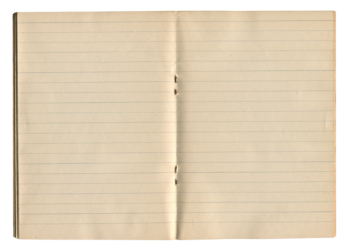 Open vintage school handwriting notebook with wide ruled pages isolated on white