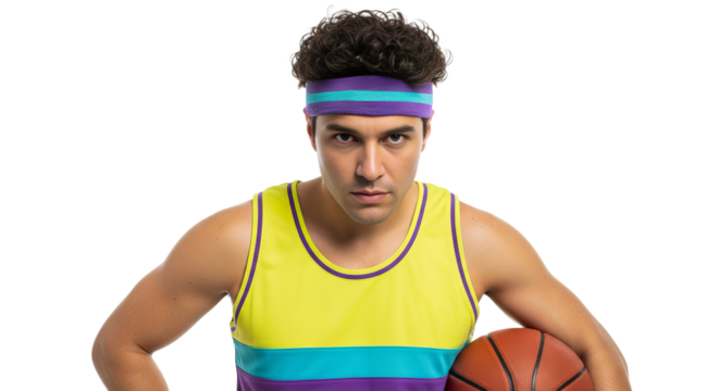 Man wearing 80s style headband and sports outfit holding basketball against a plain white backdrop