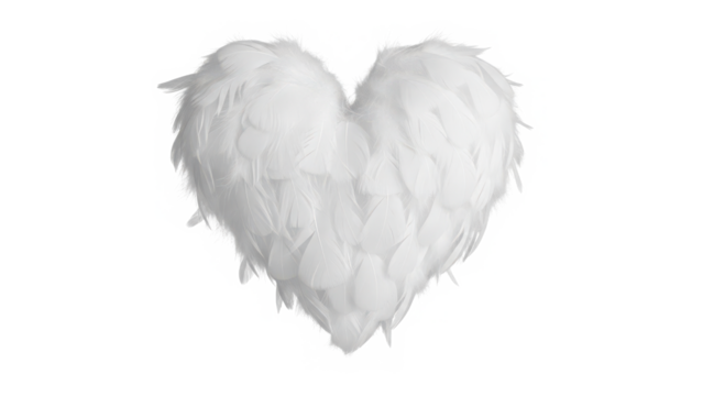 A delicate white heart made of soft feathers symbolizing purity and angelic love isolated on transparent background
