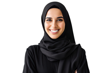 Portrait closeup of muslim woman in hijab smiling and looking at camera isolated on transparent background